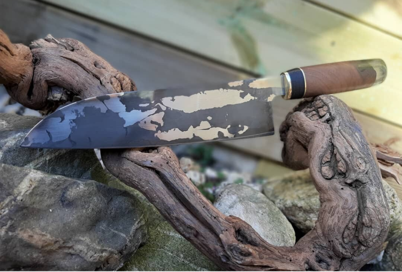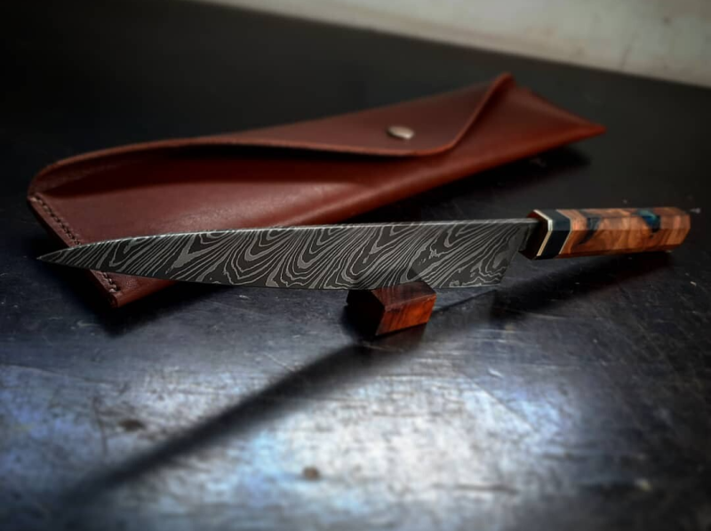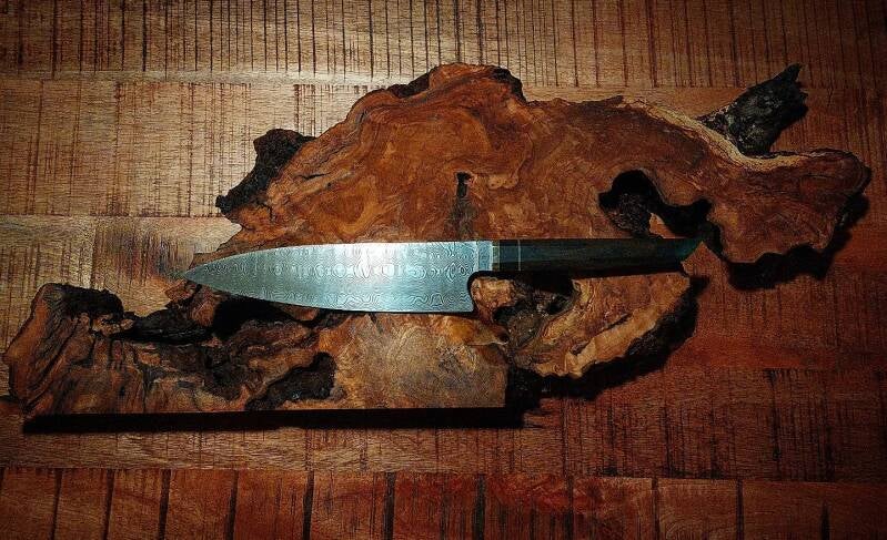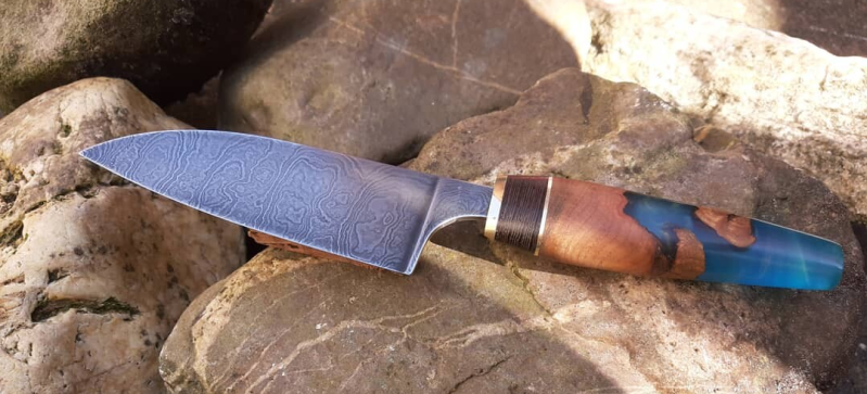 Wild damast RVS met Ziricote heft en metallic groene epoxy