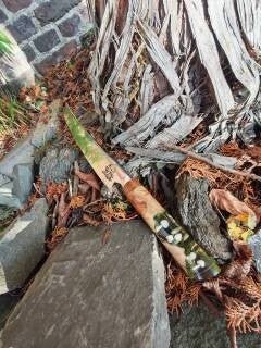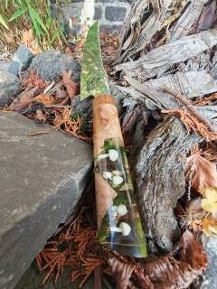 het blad is dik boven en zeer dun bij het snijvlak. Met de mooie patronen is het een echte eyecatcher. Het heft is gemaakt van Nederlandse iep en epoxy met een diorama van in het donker lichtgevende paddenstoelen.